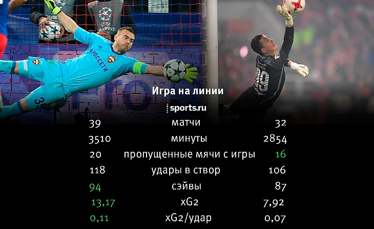 В створ ворот Акинфеева и Лунева приходится примерно одинаковое число ударов, однако ЦСКА дает соперникам бить из более выгодных позиций, чем «Зенит». В этом сезоне удельный вес ударов в створ ворот питерцев – 2,27 xG2 за 12 игр. Удары в створ ворот Акинфеева намного опаснее – 4,17 xG2 за 10 матчей.
