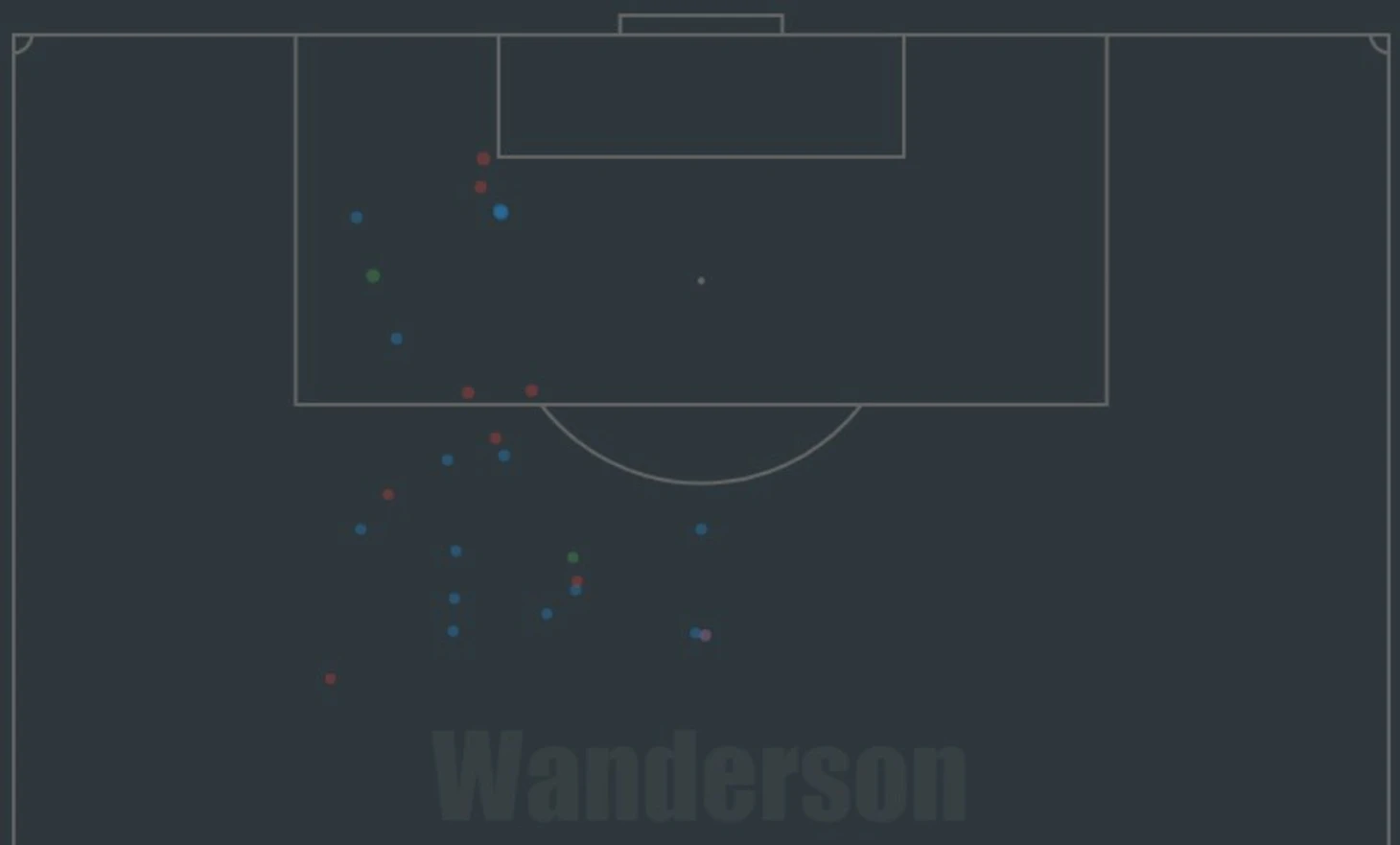 Карта ударов Вандерсона (зеленые точки – голы, красные – удары мимо, синие – заблокированные защитниками и отбитые вратарями).