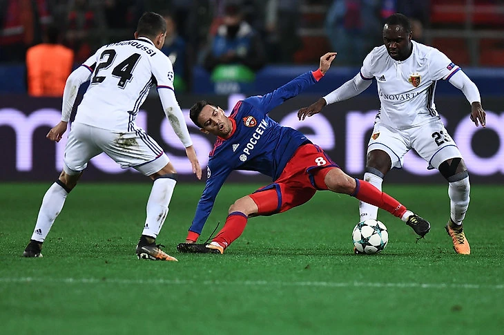 До перерыва команды почти поровну владели мячом (48% на 52% в пользу швейцарцев), но характер у этого владения был разным. ЦСКА редко оказывал давление без мяча на чужой половине поля, поэтому защитники гостей без проблем продвигались к центральной линии или даже за нее, после отдавая передачи вперед. При первой фазе атаки армейцев игроки «Базеля» выдвигались очень высоко и четко разбирали всех. Армейцы постоянно принимали мяч лицом к своим воротам, не имели возможности развернуться и пасовали назад.