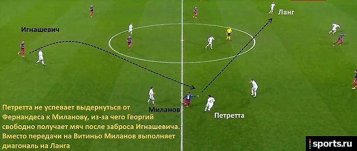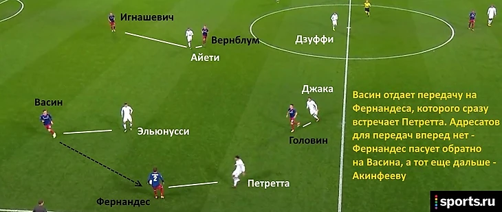 В прошлом сезоне, когда у ЦСКА не получалось переходить центральный круг через передачи низом, либо, когда Гончаренко хотел минимизировать риск потерь на своей половине (как в апрельском матче с «Ростовом»), армейцы использовали диагонали Игнашевича на Фернандеса. Вчера их почти не было: во-первых, Сергей был самым центральным из трех защитников (слева диагонали на правый край эффективнее), а, во-вторых, русского бразильца грамотно опекал Петретта. До своей замены Игнашевич выполнил всего две длинные передачи на Фернандеса, лишь одна из них была направлена к штрафной «Базеля», но и она оказалась неточной.
