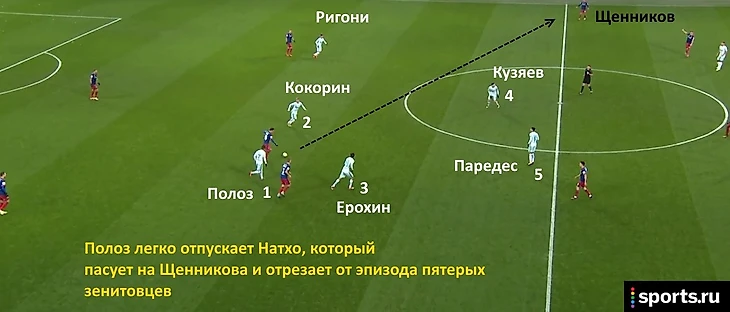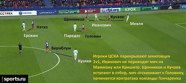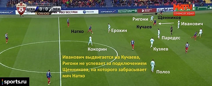 Почти полное отсутствие моментов у «Зенита» до перерыва (если не считать удар Полоза после прострела Ерохина) связано далеко не только с пассивностью игроков атаки, в отличие от легкого перехода ЦСКА с мячом на половину питерцев. На троих Ригони, Кокорин и Полоз совершили только один отбор за тайм (Кокорин) и ни разу не перехватили мяч на чужой половине. Чаще всего атаки ЦСКА шли через Натхо, на которого гости совсем не оказывали давления.