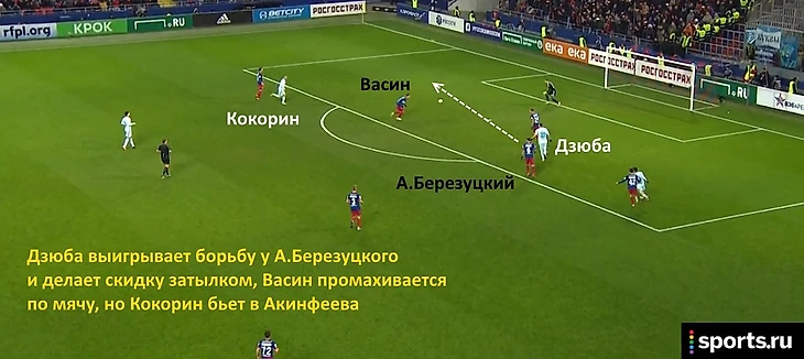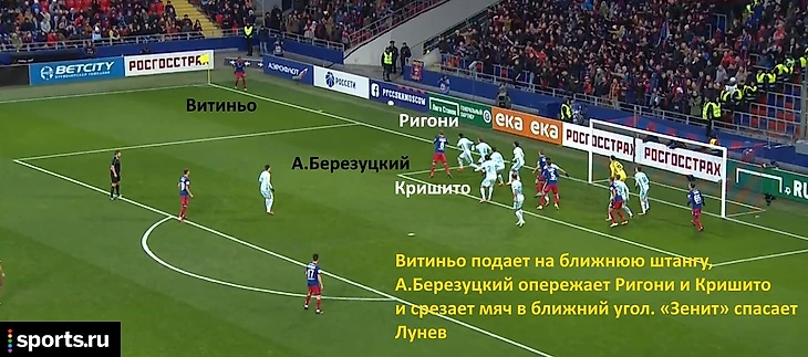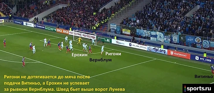 Из 10 ударов ЦСКА в первом тайме 5 были нанесены со стандартов, в том числе 3 – с угловых. Армейцы ничего не придумывали (Витиньо просто подавал на ближнюю штангу), но зенитовцы постоянно упускали оппонентов.