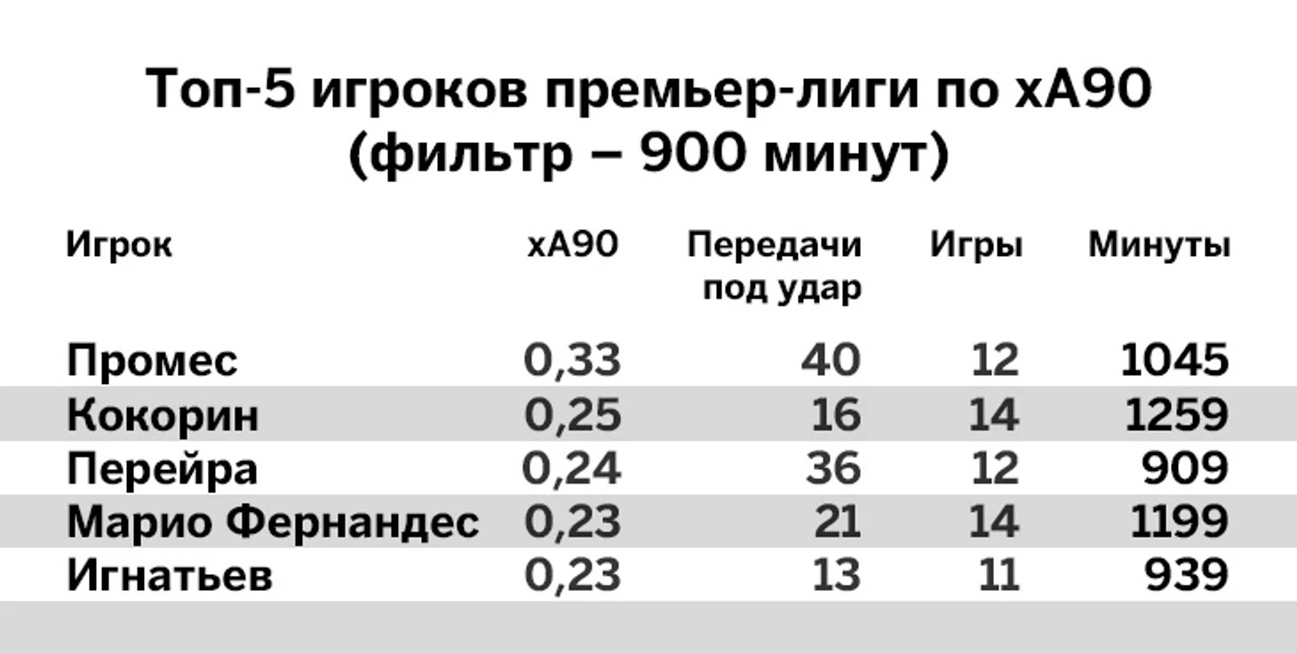 Игнатьев так и остался для Семина главным вариантом справа. Владислав отлично провел конец июля-начало августа: в шести матчах подряд он делал минимум одну передачу под удар. Продуктивные действия в матчах со СКА и «Анжи» позволяют Игнатьеву до сих пор удерживаться в топ-5 по xA за 90 минут.