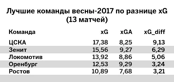 xG – качество ударов команды, xGA – качество ударов соперника, xG_diff – разница между ними. Каждому удару присваивается коэффициент в зависимости от типа удара; позиции нанесения; места начала атаки, приведшей к удару; типа паса, который привел к удару; типа момента перед ударом; скорости атаки; положения команды в матче. Подробнее – здесь.
