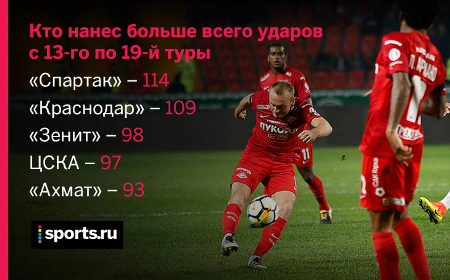 Преимущество «Спартака» и «Краснодара» над «Зенитом» в общем числе ударов ощутимо, отрыв петербуржцев от преследователей (ЦСКА, «Ахмат», «Динамо», «Арсенал») совсем невелик.