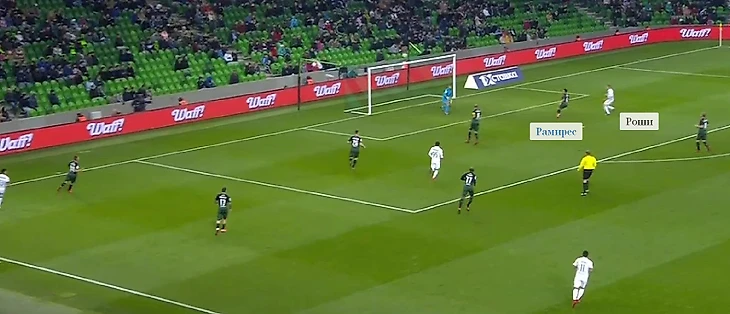 Очень спорное мнение. Рамирес действовал по мячу и чувствовал Роши лишь интуитивно. До мяча защитник «Краснодара» не дотянулся, поэтому «Ахмат» мог забивать третий мяч. Конечно, прыжок Рамиреса смутил Роши, но, во-первых, это не была игра в корпус, а, во-вторых, даже при таком касании у Роши была возможность нанести акцентированный удар.