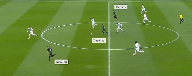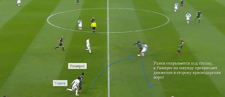 Тут к Шалимову никаких вопросов нет. Фокус на мяче и постановка руки перед оппонентом – логичные решения, которые действительно хорошо помогают защищающейся команде. «В первой фазе Кристиан действовал верно – он поставил перед соперником руку». Удивительно разъяснение тренера итога момента – Рамирес уступил борьбу, а Уциев получил передачу после стенки: «Он проиграл в скорости».