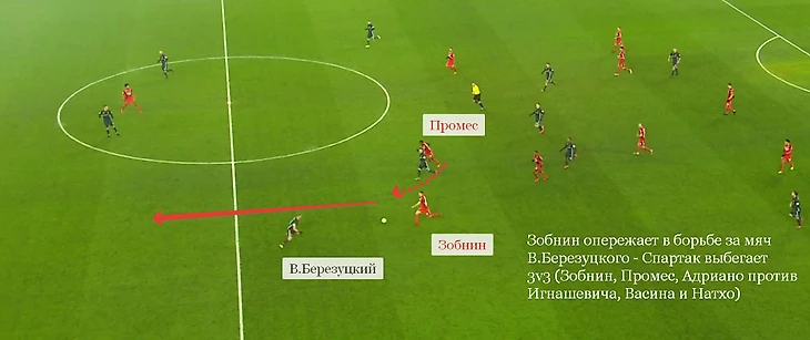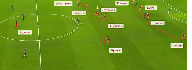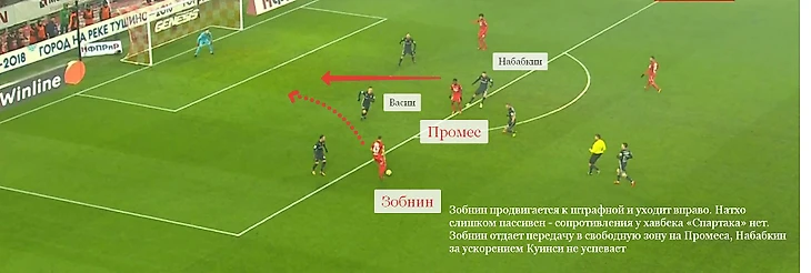 На 25-й минуте Каррера сделал первую перестановку в матче. Зобнин ушел в центр поля, Мельгарехо – на левый фланг обороны, а Самедов – направо в полузащиту. Это решение итальянца позволило «Спартаку» найти баланс в середине, но нельзя сказать, что после смещения Зобнина в центр у ЦСКА совсем не было шансов. Одна опасная атака у армейцев была – сразу после перестановок Карреры.