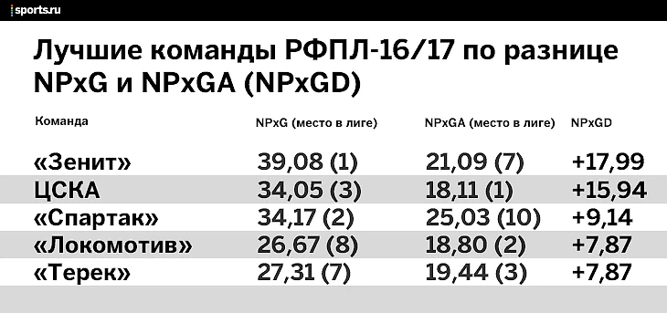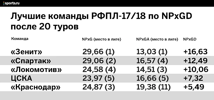 «Спартак» не только отыграл 11 очков у «Зенита», но и прибавил в качестве игры по сравнению с чемпионским сезоном-2016/17. Тогда «Спартак» был вторым по NPxG (качество ударов без учета пенальти),а по NPxGА (качество ударов соперника без учета пенальти) – и вовсе десятым.