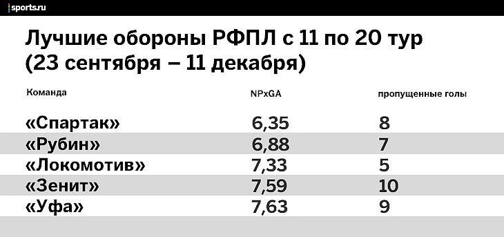 То есть после 10-го тура «Спартак» стал лучшей командой лиги по качеству обороны.