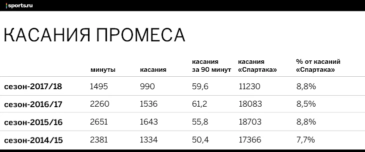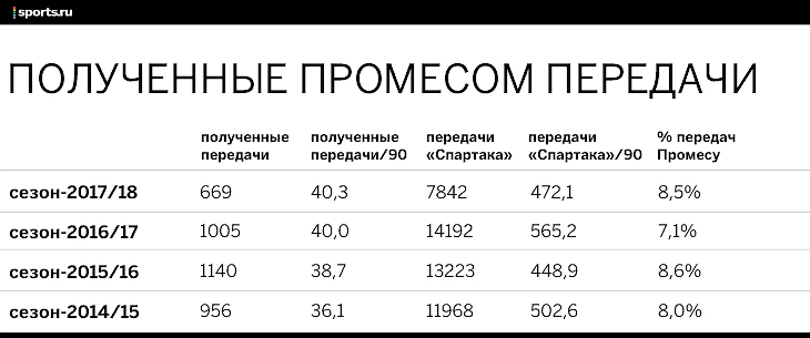 В чемпионском сезоне «Спартак» пасовался гораздо активнее (565,2 передачи за матч тогда против 472,1 сейчас), но число передач на Промеса, возросло. По этому показателю у Куинси сейчас вообще рекордный чемпионат.