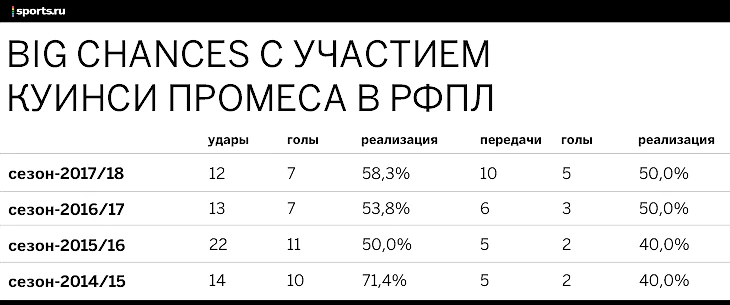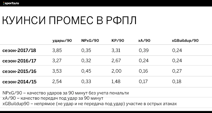 Очевидно, что четыре матча за сезон – маленькая выборка, но в сумме за три чемпионата и она показательна. На самом деле, и сухие матчи с «Зенитом» и ЦСКА Куинси проводил активно. Продвинутая статистика показывает: уровень давления Промеса на чужие ворота был нормальным, голландец точно не растворялся на поле. Логично почти всегда падало качество ударов из-за уровня сопротивления «Зенита» и ЦСКА (исключение – игры против армейцев в сезоне-2016/17)