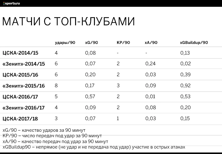 ЦСКА Промес забивал с очень выгодных позиций (0,29 и 0,35 xG) – до этого такие качественные моменты у него были лишь в одном топ-матче (второй круг сезона-2016/17, тогда один из ударов Куинси пришелся в штангу). О полном провале в больших играх в предыдущих сезонах говорить нельзя.