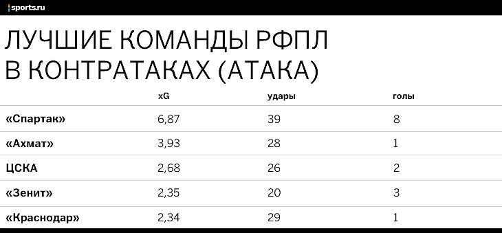 «В России такой чемпионат – побеждают команды, которые убегают со своей половины», – сказал Виктор Гончаренко после разгрома от «Спартака» (0:3). Спорить с этим сложно. Лидирующий «Локомотив» в первой части чемпионата забил после контратак 3 мяча, столько же – «Зенит» и «Динамо»). Эффективнее команды Юрия Семина – только «Спартак».