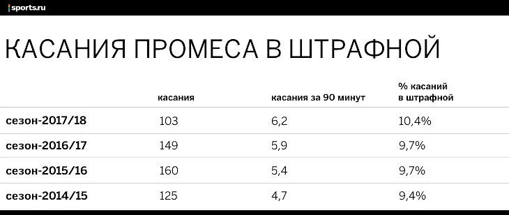 До рекорда – 22 удара, которые отнесли к явным голевым моментам в сезоне-2015/16 – Промес уже вряд ли доберется. Но изменения в качестве заметны по другому критерию.