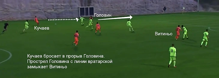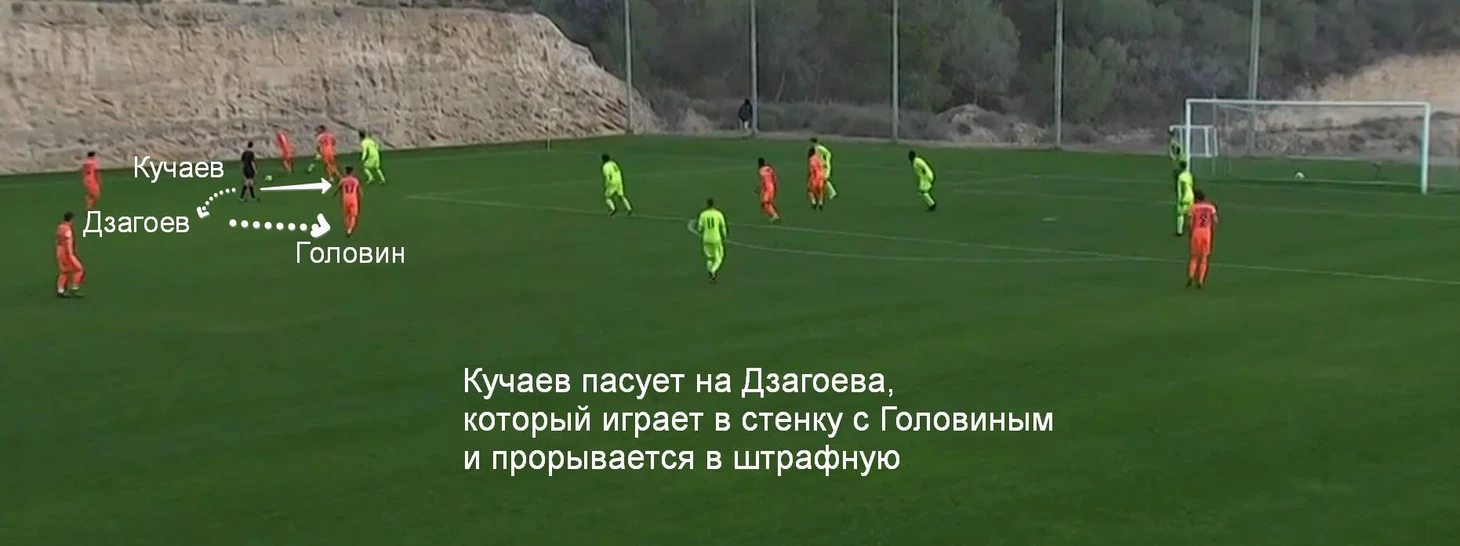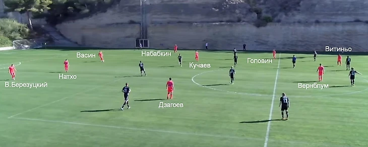 ЦСКА действительно пытался играть через короткий и средний пас низом. На поле одновременно появились Головин, Натхо, Дзагоев и Кучаев, так что мяч двигался как надо. Натхо привычно опускался к центральным защитникам, Дзагоев и Кучаев располагались в районе центрального круга, Головин – чуть левее.