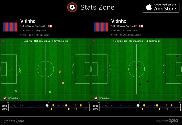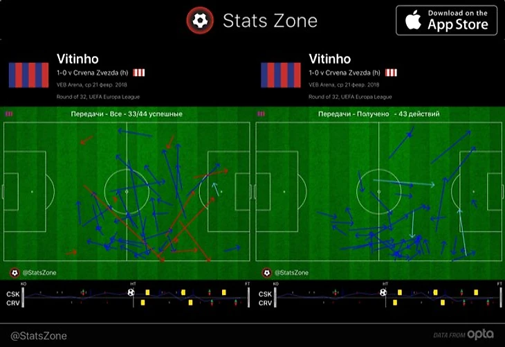 За 77 минут Витиньо совершил 68 касаний – чаще с мячом встречались только Дзагоев (76), Василий Березуцкий (75) и Натхо (73). Карта отданных и полученных передач Витиньо тоже впечатляет – акцент на правый фланг очевиден, но бразилец смещался и в центр, и на левый край.