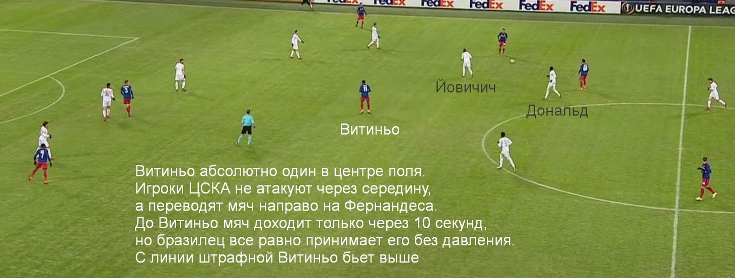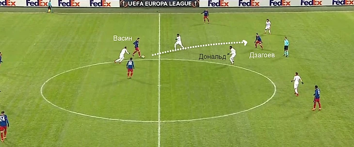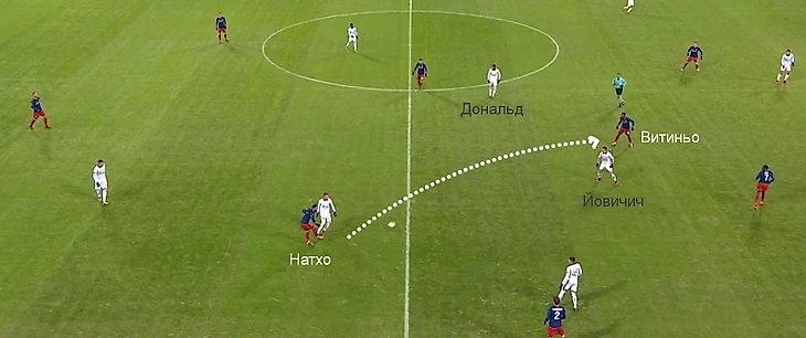Типичная атака ЦСКА в матче – перевод от центральных защитников в правый полуфланг, откуда шла передача в центр. Пара опорников сербов Йовичич – Дональд действовала очень недисциплинированно, постоянно оставляя свободные зоны за спинами. Москвичи этим пользовались и без особых проблем продвигали мяч к финальной трети.