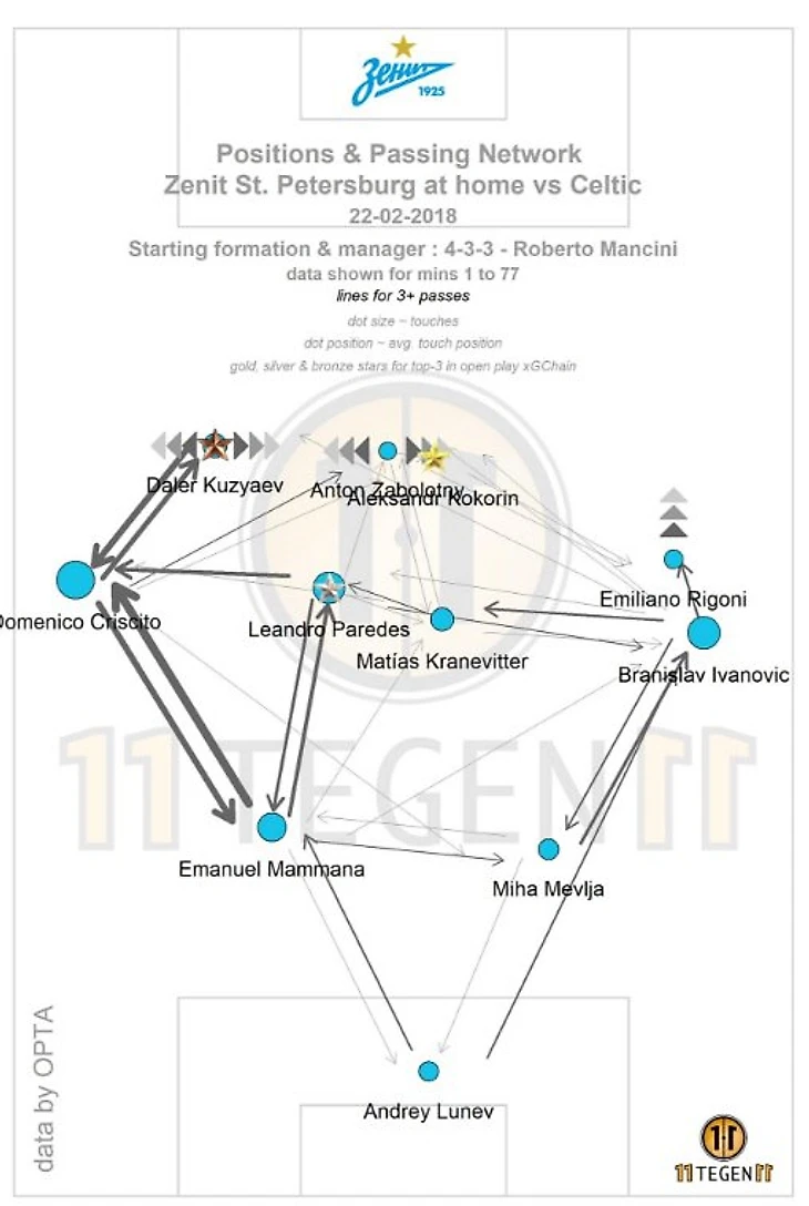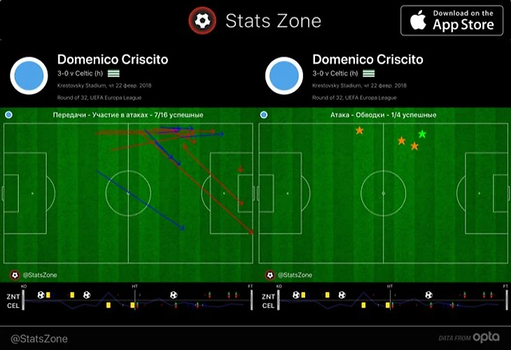 Доменико чаще всех в «Зените» касался мяча (70), отдал больше всех передач в атаку (16, 43,8% точности) и вместе с Ригони больше всех шел в дриблинг (по 4 попытки, 1 удачная у Кришито).