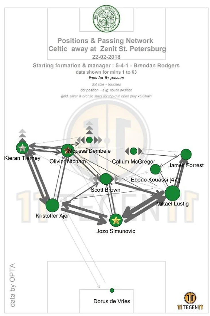 В четверг «Селтик» редко прессинговал высоко, поэтому «Зенит» почти не испытывал трудностей с продвижением мяча на чужую половину. Важную роль в начале атак играл Кришито, который забрасывал мяч в полуфланг на забегания Кузяева и Кокорина.