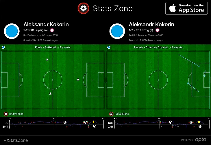 Кокорин ударил всего 1 раз, но прекрасно действовал спиной к воротам. Забросы «Зенита» вперед не прекратились даже после замены Заболотного на Дриусси, и главным их адресатом стал именно Кокорин. Во втором тайме Александо зацепился почти за все мячи, заработал два фола и разогнал несколько атак. 3 передачи под удар – лучший показатель в составе «Зенита» (в «РБ Лейпциг» больше только у Форсберга – 5).