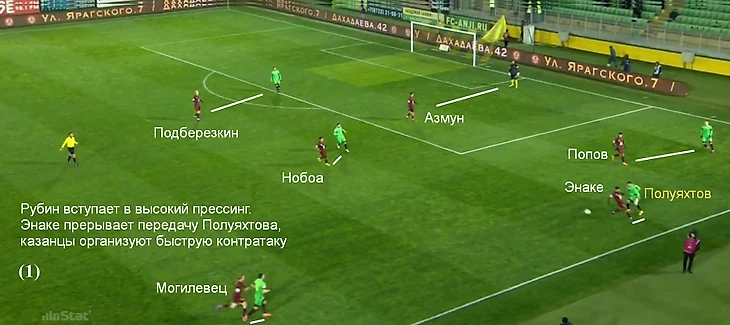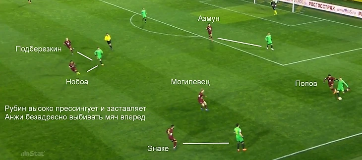 В первых играх весны «Рубин» прессинговал выше и слаженнее, чем осенью. Более показателен в этом контексте матч с «Анжи» (6,44 PPDA). «Тосно» непривычно мало для соперника команд Бердыева владел мячом (33,5%) и начинал атаки забросами от вратаря Опарина или центрального защитника Буйволова.