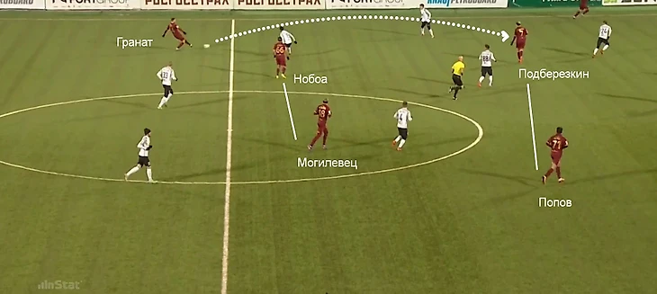 При позиционной атаке Нобоа и Могилевец располагаются в районе центрального круга, а Подберезкин поднимается на одну линию с Поповым. Крайние центральные защитники «Рубина» (Гранат и Камболов) обладают качественным пасом, поэтому весной казанцы начинают атаки не только длинными передачами.