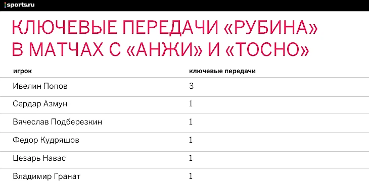 За два матча «Рубин» нанес всего 9 ударов, но треть из них – после передач Попова. Это лучший показатель в команде.