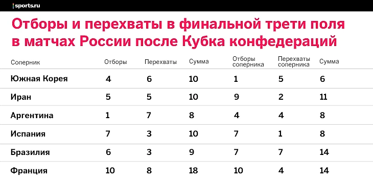 После Кубка конфедераций Россия провела шесть матчей (без учета праздника с московским «Динамо»), из них четыре – против Аргентины, Испании, Бразилии и Франции. Лишь в двух играх за последние полгода Россия уступила по количеству отборов и перехватов в финальной трети поля.