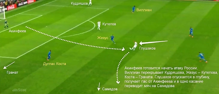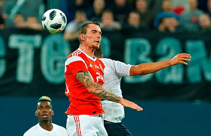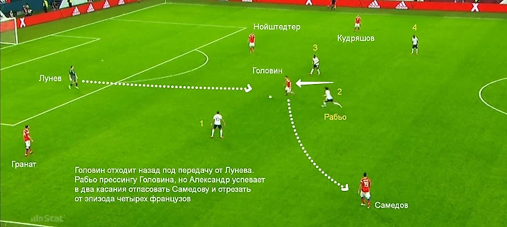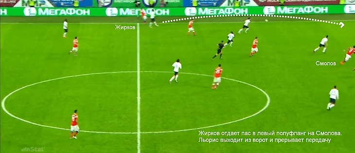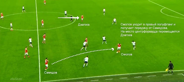 В сборной Смолов такой же центрфорвард, как и в «Краснодаре», но диапазон его действий даже шире. У России большие проблемы с позиционной атакой: в средней трети поля мяч часто не доходит до центральных полузащитников. Поэтому латерали сразу отдают проникающие передачи на Смолова, который вынужден смещаться в полуфланги, а на его место перемещается кто-то из полузащитников (против Франции – Дзагоев, Ерохин или Алексей Миранчук)