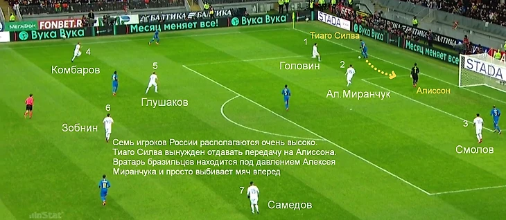 Бразилии мы проиграли и по числу отборов, и по количеству перехватов вблизи чужих ворот, но качество прессинга отражается не только в этом. В нескольких эпизодах Россия вынуждала бразильских защитников отдавать передачи назад Алиссону, который просто выносил мяч к центральному кругу.