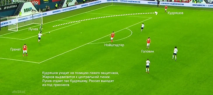 Прошлой осенью активнее вперед выдергивался Джикия. Это не всегда приносило отборы и перехваты (а иногда и вовсе приводило к опасным передачам соперников в оставленные зоны), но стратегия очевидна: Россия стремится забирать мяч еще до центрального круга.