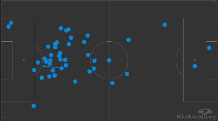 Вот, например, карта касаний Смолова в матче с «Динамо» (10 марта).
