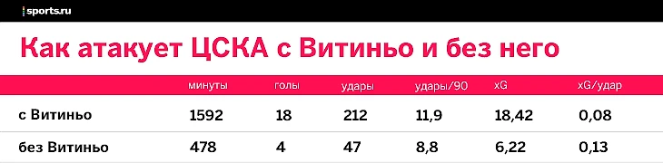Бразилец сыграл во всех 23 матчах сезона, но без него ЦСКА провел почти 500 минут. Это не самая большая выборка, но и по ней можно сравнить атаки ЦСКА с Витиньо и без него.