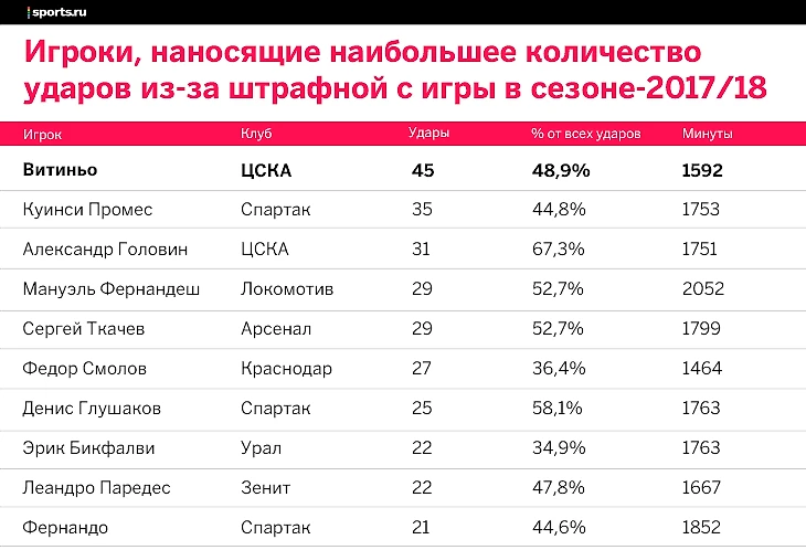 В чемпионате-2017/18 Витиньо забил 8 голов (2 – с пенальти), он лучший бомбардир ЦСКА. А еще бразилец много, очень много бьет из-за пределов штрафной. За 23 матча у Витиньо 60 ударов с дистанции – это с отрывом 1-е место в лиге . Фернандо пробил 45 раз, Куинси Промес – 42, Леандро Паредес – 41, Мануэль Фернандеш и Сергей Ткачев – по 36.