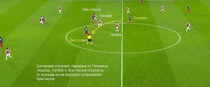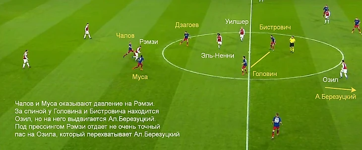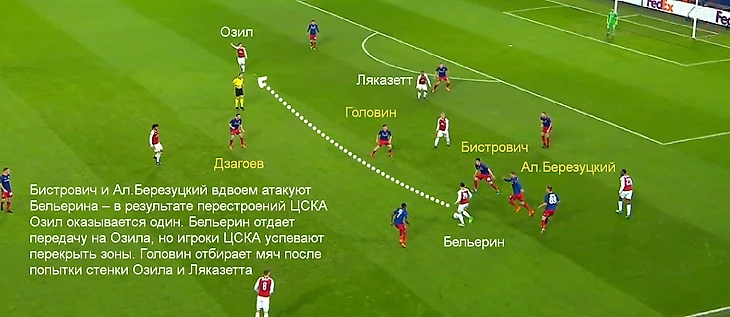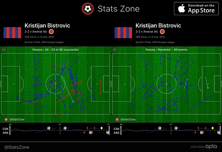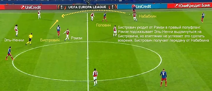 При обороне Бистрович располагался в опорной зоне вместе с Головиным. В первой игре полузащитники ЦСКА постоянно теряли Рэмзи, Озила и Уилшера (в меньшей степени), которые открывались между линиями в середине. В Москве такие проблемы возникали редко – Гончаренко умышленно сузил среднюю линию, все хавбеки располагались в центре поля, практически без смещений на фланги.