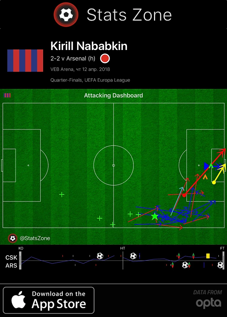 Набабкин провел одну из лучших игр в карьере. Кирилл не отличается качеством атакующих действий даже на уровне РФПЛ – логично, что в еврокубках он чаще всего проваливается. Против «Арсенала» все было иначе: гол после добивания, удар головой, который привел к голу Чалова, 4 передачи в штрафную Чеха (2 точных), 1 обводка.