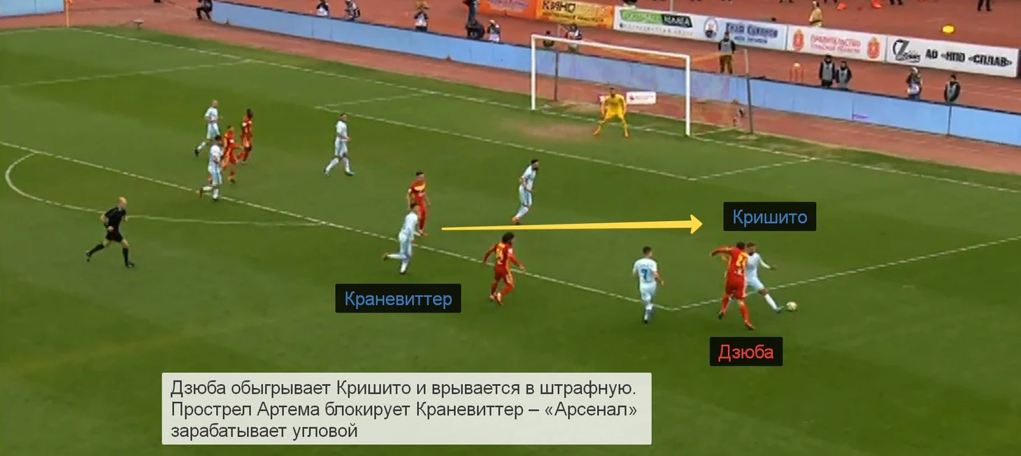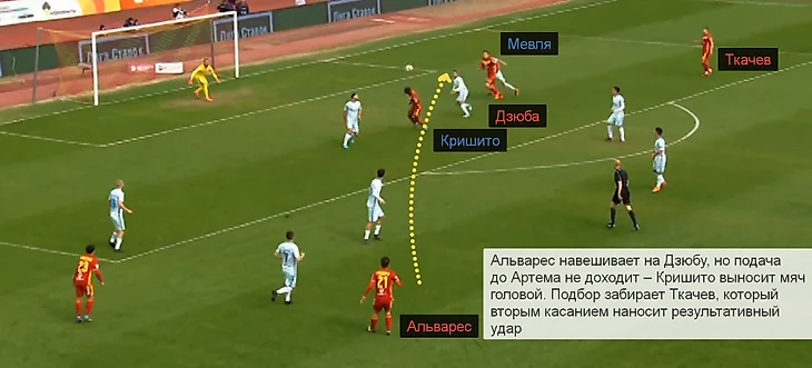 Голевая передача Дзюбы на Горбатенко была формальной – после паса хавбек обыграл трех соперников и пробил из-за пределов штрафной. В голе Ткачева на Дзюбу ассист никто не запишет, но Артем тут сыграл более важную роль – Кришито и Мевля держали его вдвоем, оставив одинокого Ткачева на правом углу штрафной.