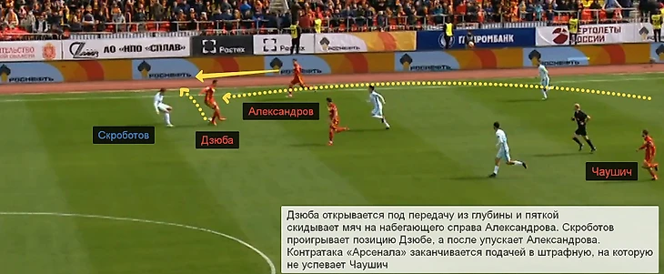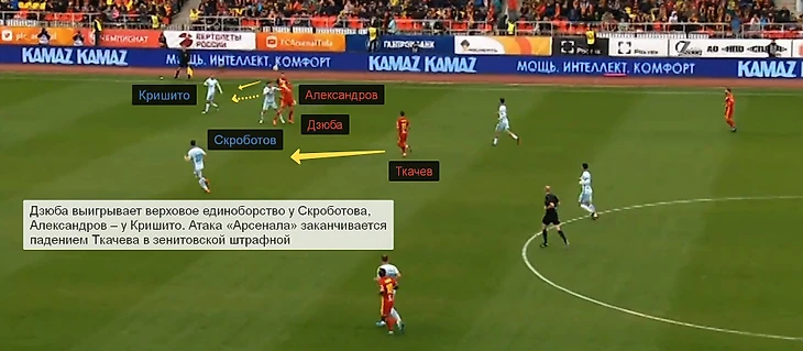 Все атаки «Арсенала» шли через Дзюбу. Нападающий отходил во фланги, часто играл спиной к чужим воротам и скидывал мячи на набегающих полузащитников. Защитники «Зенита» не играли на опережение в единоборствах с Артемом, а опорная зона привычно проваливалась – так «Арсенал» получал возможности для быстрых контратак. Замена Скроботова на Смольникова в этом смысле ничего не поменяла.