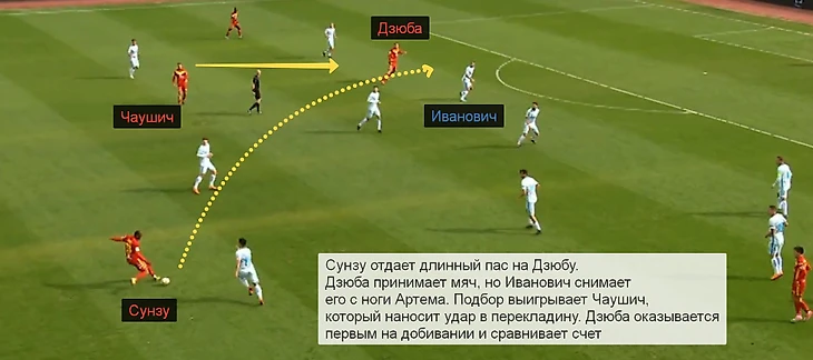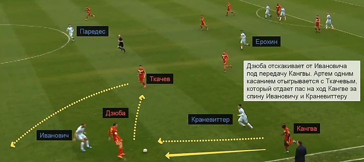 В первом тайме Дзюба был подыгрывающим – 0 ударов, зато 2 участия в голевых атаках и разгон нескольких контратак. Началось все на 3-й минуте, когда Артем пяткой отправил в прорыв Михаила Александрова.