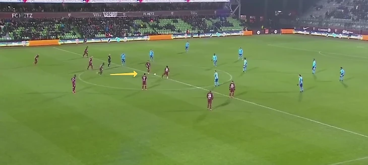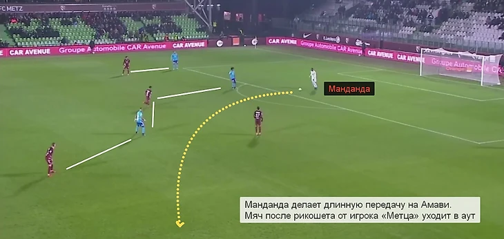 После того как Манданда забрал мяч в руки, «Метц» вступил в прессинг, перекрыв направления для короткой передачи.