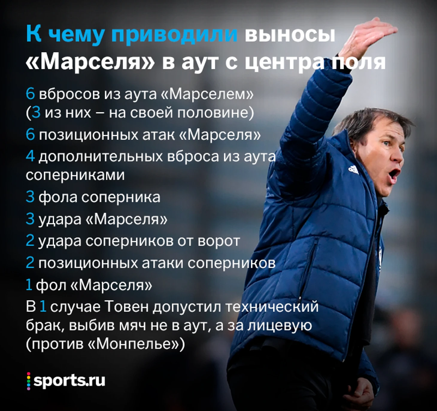 В 26 случаях «Марсель» выбивал мяч за правую боковую линию (на этом фланге играет Товен). 2 выноса (против «Браги» и «Дижона») делались влево – за них отвечал Жермен, а Товена в этот момент не было на поле.