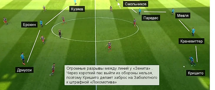 2. У «Зенита» нет игры в атаке. В первом тайме «Локо» оборонялся низкими блоками и отдал гостям мяч. Это был простой, но эффективный план Семина: «Зенит» был катастрофически плох в позиционных атаках, а будущий чемпион допустил всего пару опасных потерь на своей половине.