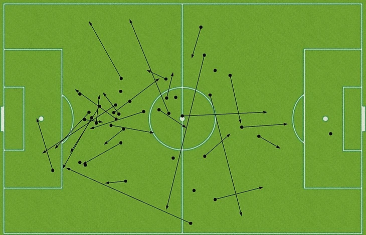 Карта действий Игуаина в матче с Италией. Стрелки – передачи, круги – единоборства.