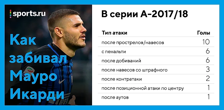 Икарди забил 29 голов (столько же у Иммобиле из «Лацио»), не войдя в топ-10 по количеству ударов. Мауро нанес всего 101 удар – 12-й результат в лиге (у Иммобиле 110 ударов – 7-е место). Икарди не стал самым бьющим даже в «Интере» – Перишич пробил 116 раз. Потрясающая эффективность, которая объясняется другими цифрами «Интера» в атаке.