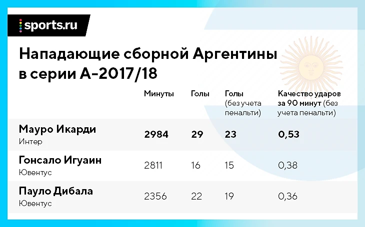 Бенедетто и Агуэро осенью действовали не очень удачно, но все равно чаще Икарди участвовали в атакующих действиях. Форварды тоже отдавали наименьшее количество передач в команде, но их было не меньше 17 (у Икарди – не больше 8) при примерно одинаковом числе пасов у Аргентины (650-700).