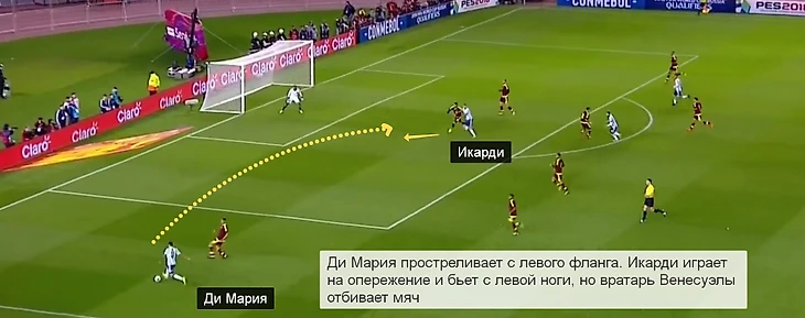 За 180 минут Икарди лишь однажды попал в любимую комбинацию – перевод мяча на фланг с последующим прострелом. Передача Ди Марии была хороша, Икарди сыграл на опережение, но Венесуэлу спас вратарь.