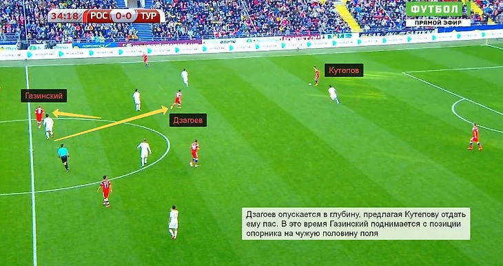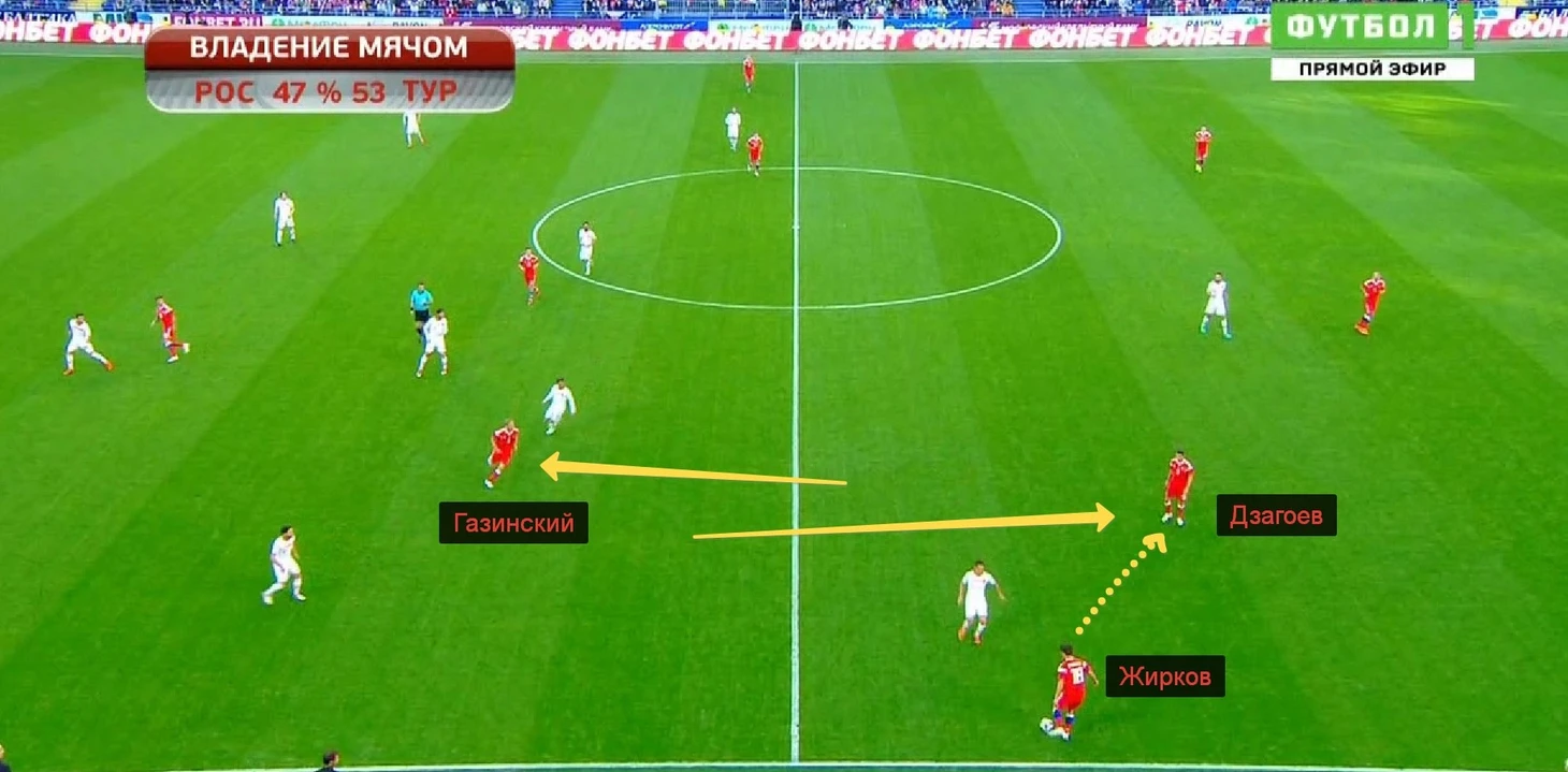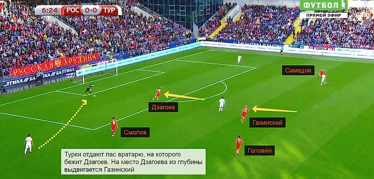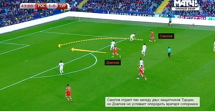 Когда Россия доходила до финальной трети поля, Дзагоев регулярно оказывался на месте центрфорварда – Смолов чаще обычного сваливался на фланги. В первом тайме Алан был близок к выходу один на один после передачи Федора, но турецкий вратарь успел перехватить мяч.