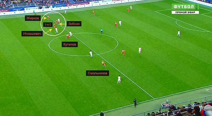 На левом фланге наши получили абсолютно ненужное преимущество 3-в-2 (Жирков мог забрать игрока Зобнина, Зобнин – Игнашевича, Игнашевич – Кутепова – тогда Кутепов действовал бы по Малли).