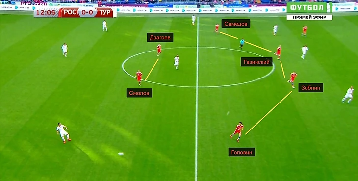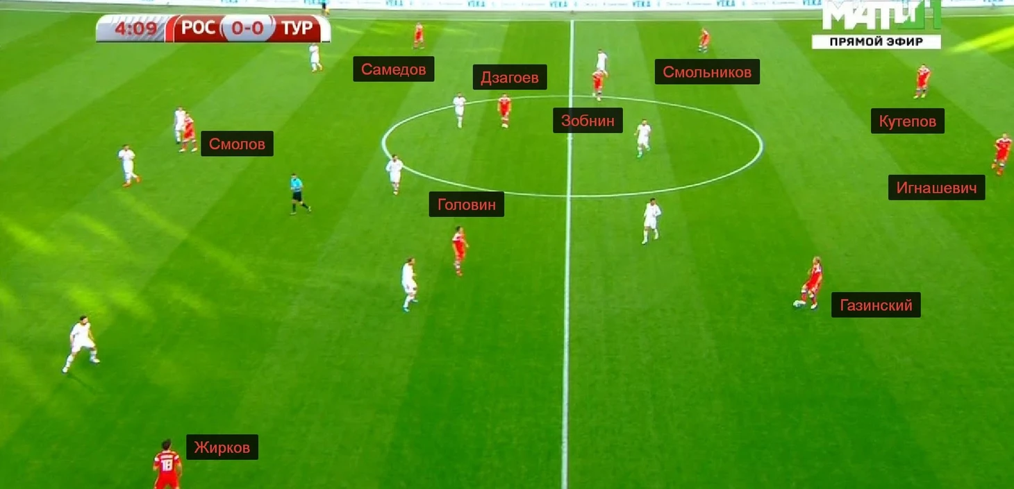 Поменялась не только часть состава, но и схема. От 4-5-1 при позиционной обороне (с Головиным в качестве чуть выдвинутого вперед центрального полузащитника) Россия перешла к 4-4-2, в которых Дзагоев располагался на одной линии со Смоловым.